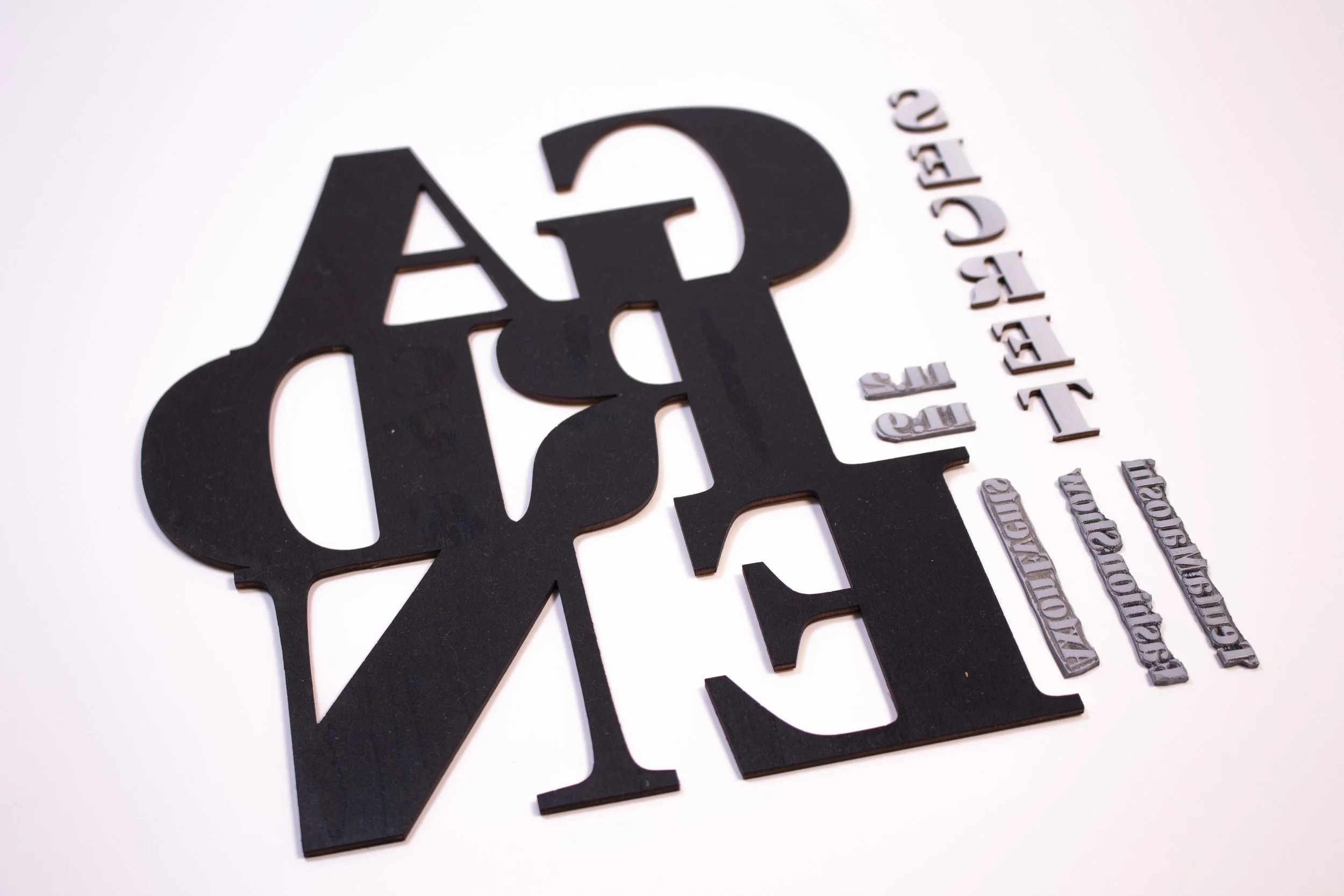 Laser-cut wood and rubber stamps were used to print the type. The poster was printed in three layers: first the background gradient, then the large black type, then the smaller gray type .